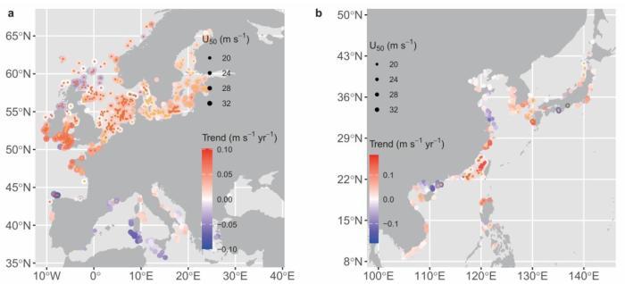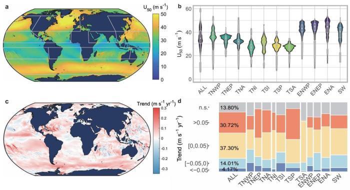 在本項(xiàng)研究中,論文共同通訊作者、南方科技大學(xué)教授曾振中和同事及合作者一起,分析了全球海洋1940年至2023年的每小時風(fēng)速數(shù)據(jù)。他們發(fā)現(xiàn),全球超過60%的沿海區(qū)域呈現(xiàn)極端風(fēng)速顯著上升的趨勢,并常與全球變暖下的天氣系統(tǒng)變化相關(guān)。