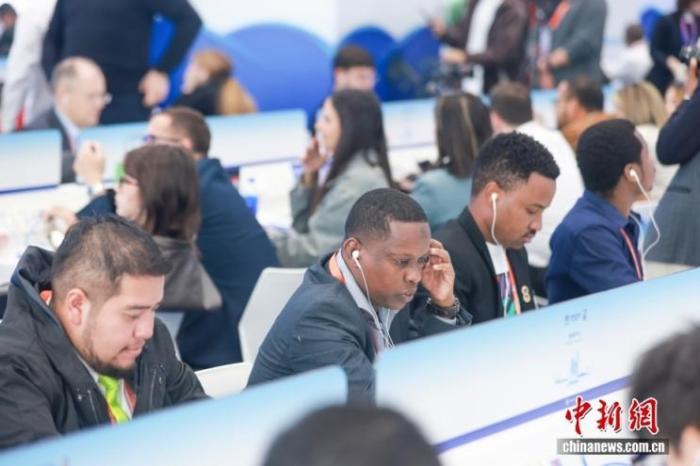 11月5日,第八屆中國國際進口博覽會暨虹橋國際經(jīng)濟論壇開幕式在國家會展中心(上海)舉行。圖為外國媒體記者在新聞中心收聽開幕式上的嘉賓發(fā)言。中新社記者 賈天勇 攝
