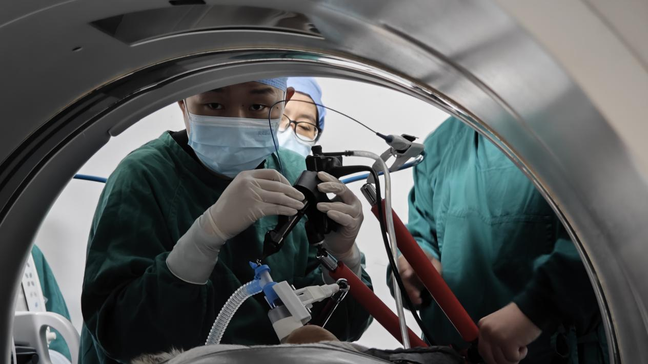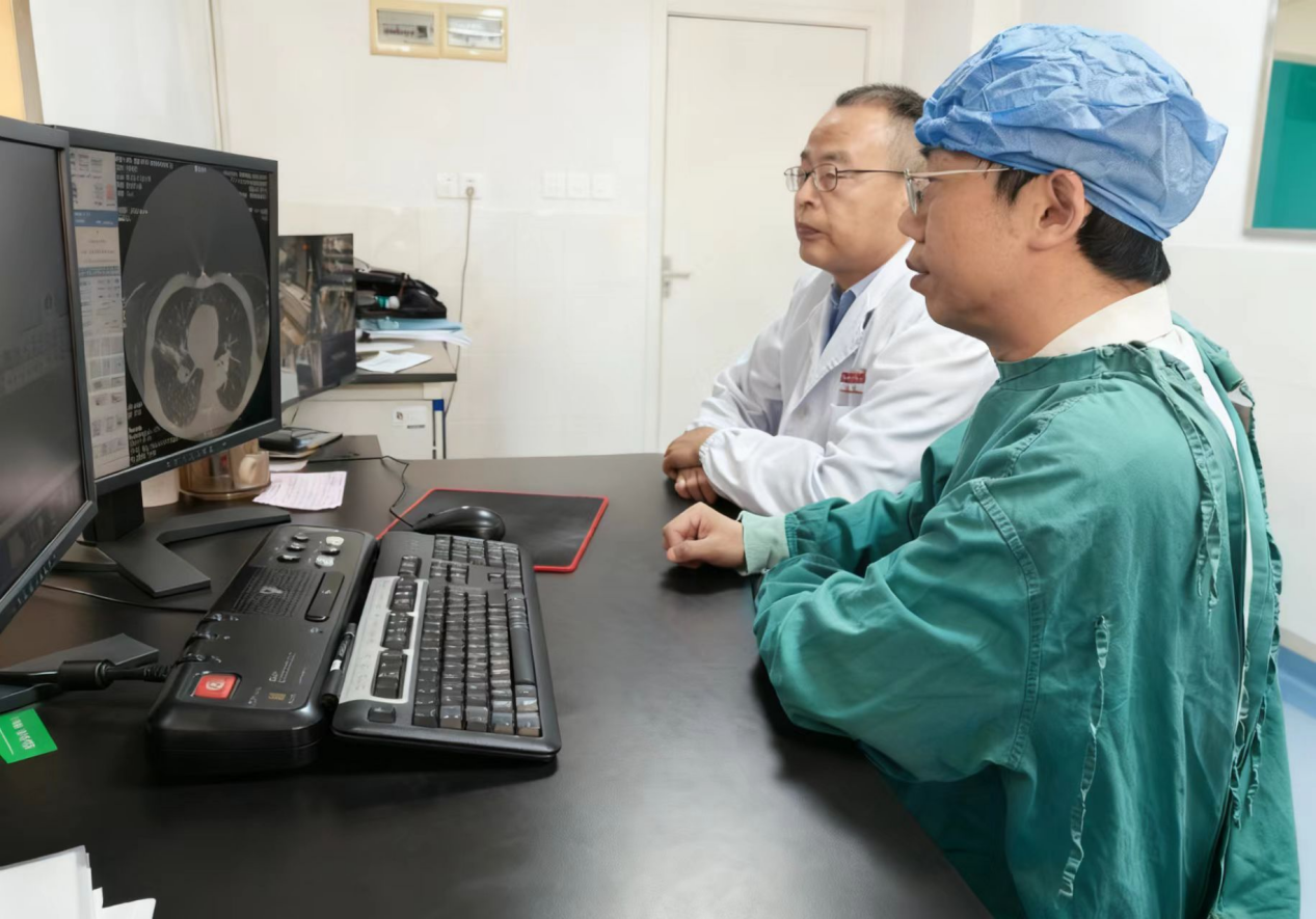 針對兩名患者的復(fù)雜病情,醫(yī)院啟動MDT多學(xué)科聯(lián)合診療機(jī)制。放射影像科、核醫(yī)學(xué)科、疼痛科、胸外科、腫瘤科等多學(xué)科專家共同研討,呼吸與危重癥醫(yī)學(xué)科劉鈞副主任醫(yī)師、邱琦主治醫(yī)師等反復(fù)評估患者病情,經(jīng)與家屬充分溝通后,最終決定采用AI+AR光學(xué)導(dǎo)航支氣管鏡聯(lián)合徑向超聲引導(dǎo)下的冷凍消融術(shù),在精準(zhǔn)作用于病灶的同時(shí),最大程度保護(hù)患者肺功能。