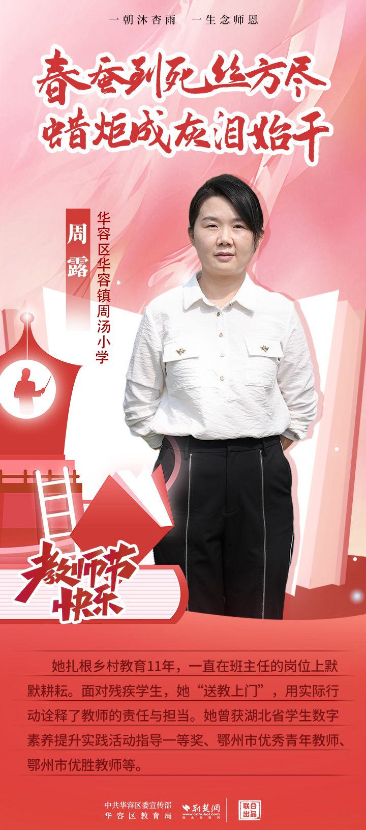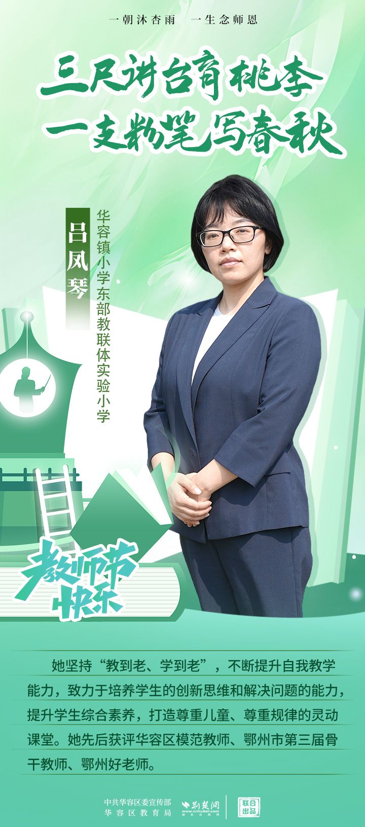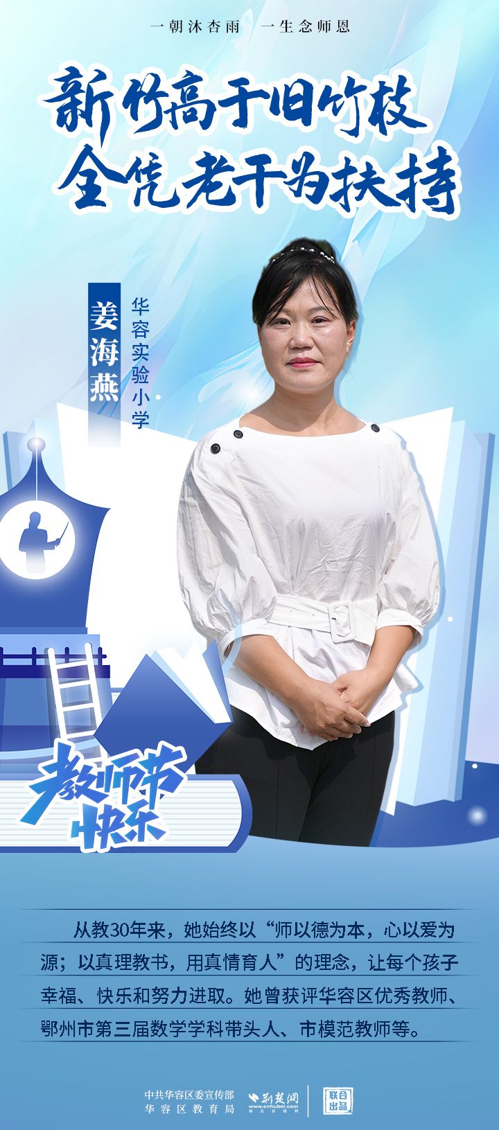 荊楚網(wǎng)(湖北日?qǐng)?bào)網(wǎng))訊(記者 劉璐 通訊員 張曉琴)百年大計(jì),教育為本;教育大計(jì),教師為本。在教師節(jié)來臨之際,中共華容區(qū)委宣傳部聯(lián)合荊楚網(wǎng)(湖北日?qǐng)?bào)網(wǎng))推出創(chuàng)意海報(bào),姜海燕、廖進(jìn)等6名老師入選“荊楚好老師”群星計(jì)劃。她們?彰顯了新時(shí)代教師的風(fēng)采,?為教育事業(yè)的發(fā)展貢獻(xiàn)了重要力量?,向了不起的她們致敬!