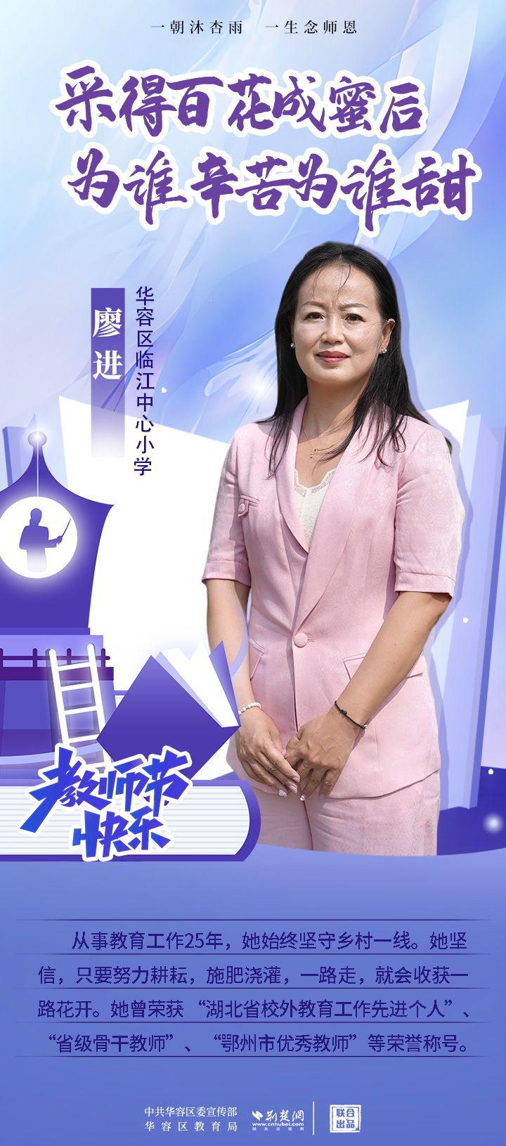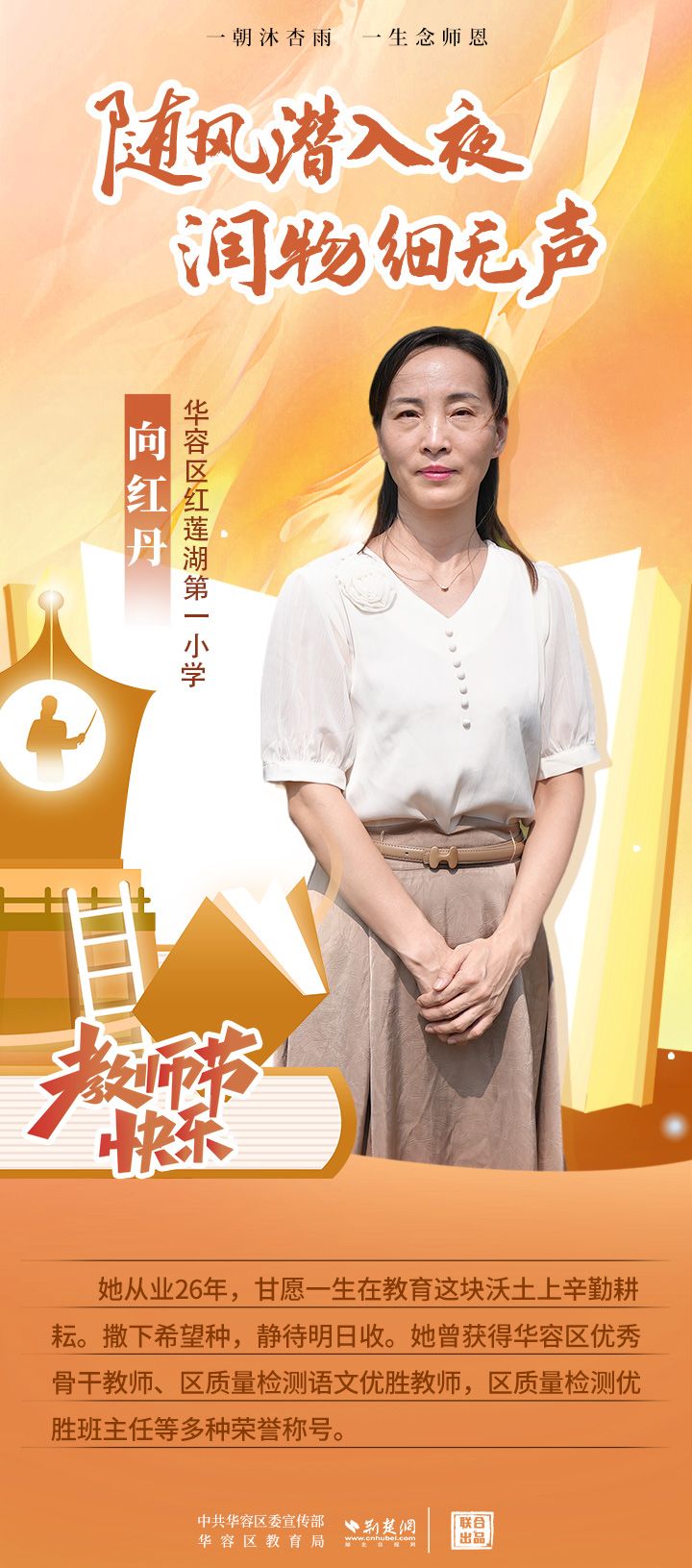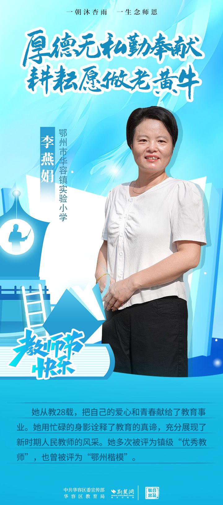 荊楚網(wǎng)(湖北日?qǐng)?bào)網(wǎng))訊(記者 劉璐 通訊員 張曉琴)百年大計(jì),教育為本;教育大計(jì),教師為本。在教師節(jié)來臨之際,中共華容區(qū)委宣傳部聯(lián)合荊楚網(wǎng)(湖北日?qǐng)?bào)網(wǎng))推出創(chuàng)意海報(bào),姜海燕、廖進(jìn)等6名老師入選“荊楚好老師”群星計(jì)劃。她們?彰顯了新時(shí)代教師的風(fēng)采,?為教育事業(yè)的發(fā)展貢獻(xiàn)了重要力量?,向了不起的她們致敬!