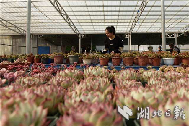 據(jù)了解,該大棚是當(dāng)?shù)乩杳?、杜靜、黎姣等5名創(chuàng)業(yè)女青年返鄉(xiāng)創(chuàng)辦的。2016年初,她們共同投資100萬元返鄉(xiāng)創(chuàng)辦青葉多肉植物種植專業(yè)合作社,種植面積30畝,近千個(gè)品種,借助“互聯(lián)網(wǎng)+”平臺(tái),把多肉植物產(chǎn)品放到網(wǎng)上銷售,年產(chǎn)銷多肉植物30多萬株。社里還帶動(dòng)附近10多個(gè)村近百名建檔立卡貧困農(nóng)戶發(fā)展花卉種植,成為當(dāng)?shù)剞r(nóng)民脫貧致富新路徑,助力鄉(xiāng)村振興。(視界網(wǎng)劉建平攝)