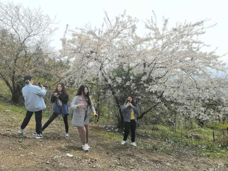 登上山頂,漫山遍野的櫻花開放在樹叢中,大幕的櫻花長得特別的素雅,游客看了心中便升起一股憐愛之情。