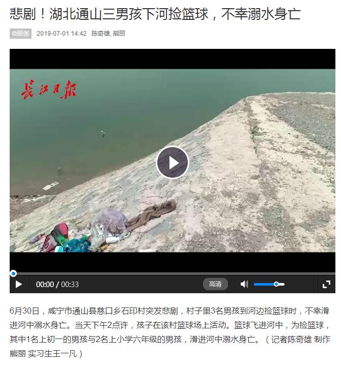 6月30日,咸寧市通山縣慈口鄉(xiāng)石印村突發(fā)悲劇,村子里3名男孩到河邊撿籃球時,不幸滑進河中溺水身亡。當(dāng)天下午2點許,孩子在該村籃球場上活動?;@球飛進河中,為撿籃球,其中1名上初一的男孩與2名上小學(xué)六年級的男孩,滑進河中溺水身亡。(記者陳奇雄 制作 熊麗 實習(xí)生王一凡)