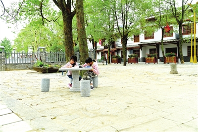 寧靜的羊樓洞廣場上,安靜地做功課的孩子。 通訊員 黃富清 攝