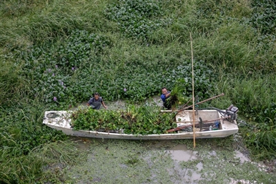 10月15日,工人們正在淦河窯嘴大橋處打撈外來物種水葫蘆。據(jù)悉,因水葫蘆繁殖過快,若成片聚集會(huì)造成水質(zhì)惡化。入夏以來,向陽湖國家濕地公園管理處將外來物種清理列為常規(guī)工作,不定期組織人員在公園內(nèi)進(jìn)行打撈清除,守護(hù)一湖清水。通訊員吳濤徐元紅攝